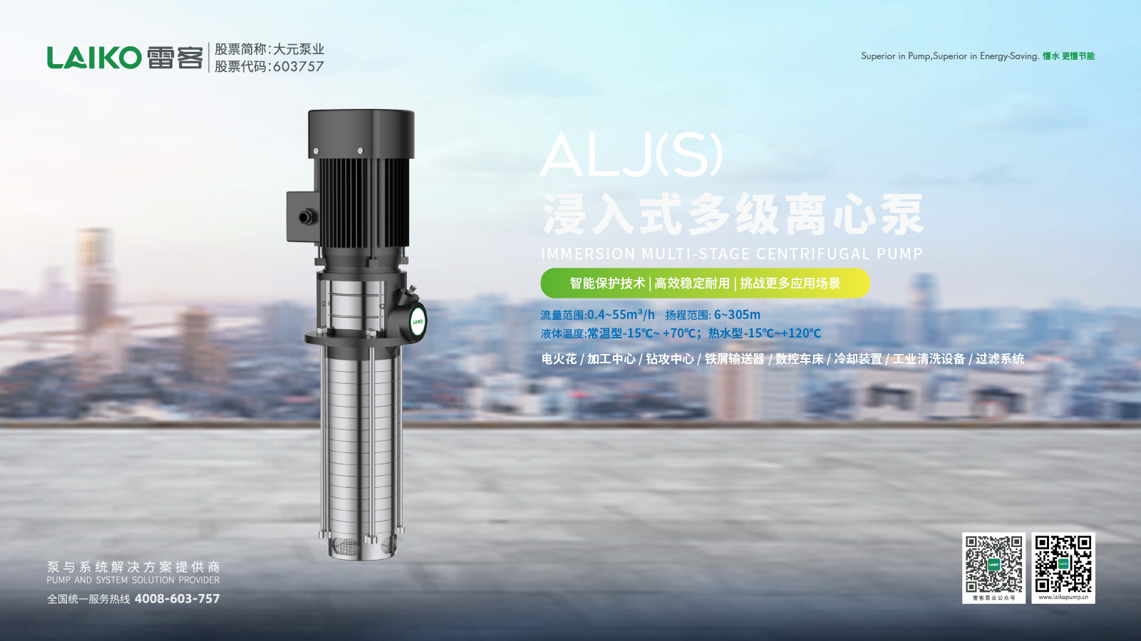 ALJ/ALJS为安装标准电机的非自吸立式多级离心泵,电机轴通过泵头用联轴器直接与泵轴联接,泵可根据需要配置智能保护器,对泵干转、缺相、过等进行有效保护。为满足水槽或容器的安装深度,可安装空腔体来改变泵本身的长度。