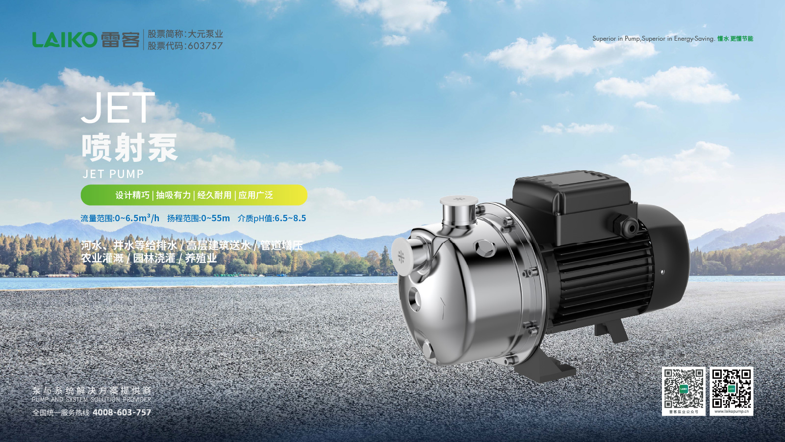 JET款喷射泵系列,是本公司研发人员最新改进,利用水喷射的原理,实现自吸功能及小流量、高扬程(高吸程)。JET款喷射泵具有寿命长、安全可靠、维修方便等特点。广泛应用于河水、井水等给排水之用,如农村、养殖、园林、旅馆、食堂及高层建筑送水等。JET系列喷射泵是一种小巧的供水系统,适用于家庭生活取水、井用提水、管道增压、农业灌溉、蔬菜大棚浇水、园林浇灌以及养殖业等场合。JET-DP系列深井喷射泵适用于农业、园林喷浇溉、蔬菜大棚供水和养殖业给排水、以及深并提水等家庭自动供水场合。
